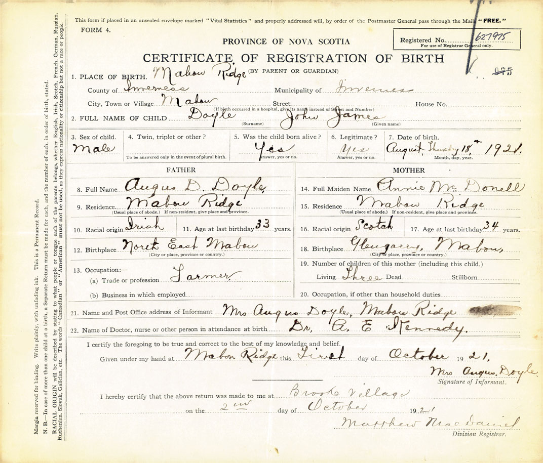 21. Name and Post Office address of Informant Mrs. Angus Doyle Mabou Ridge