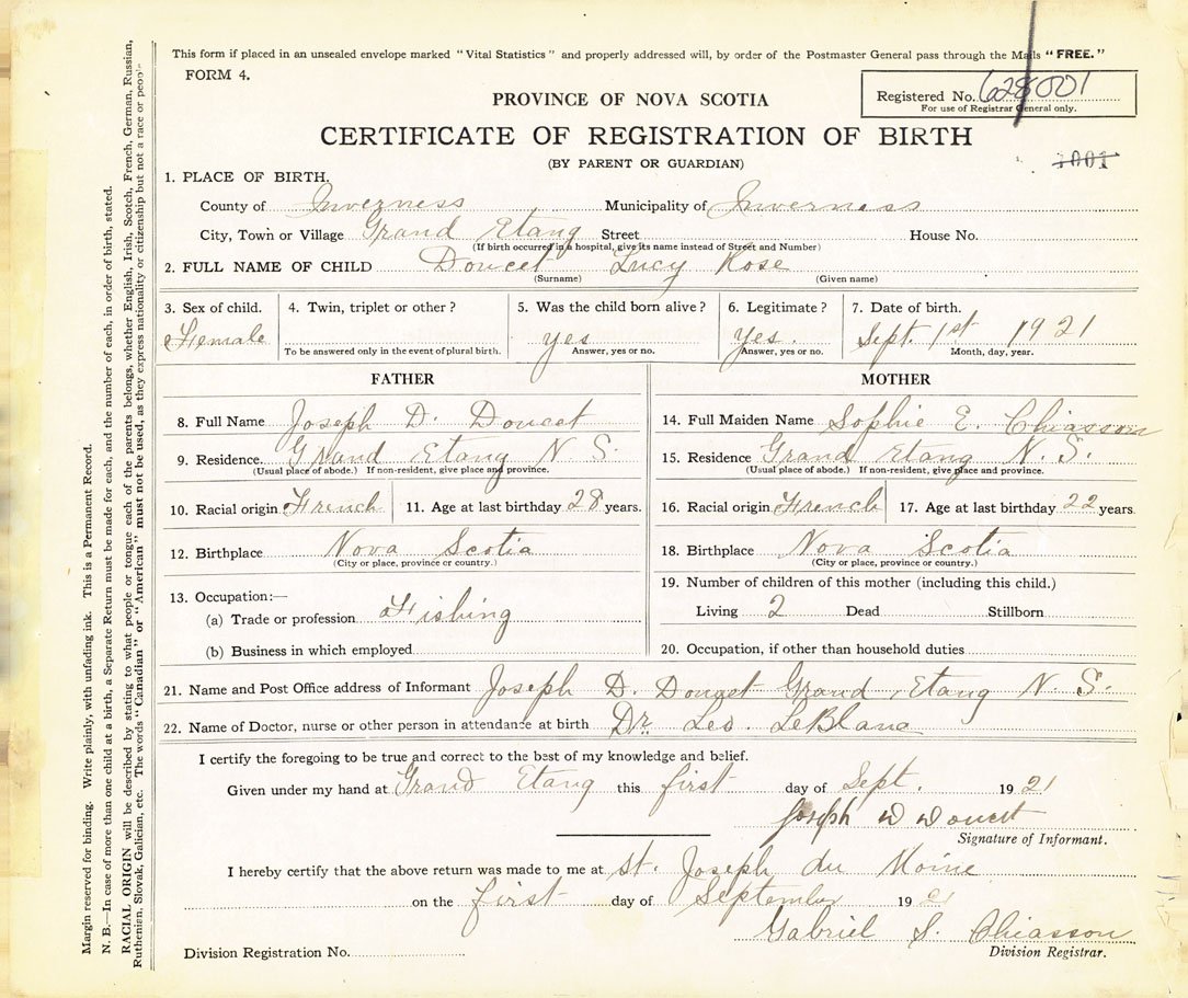 21. Name and Post Office address of Informant Joseph D. Doucet Grand Etang N.S.
