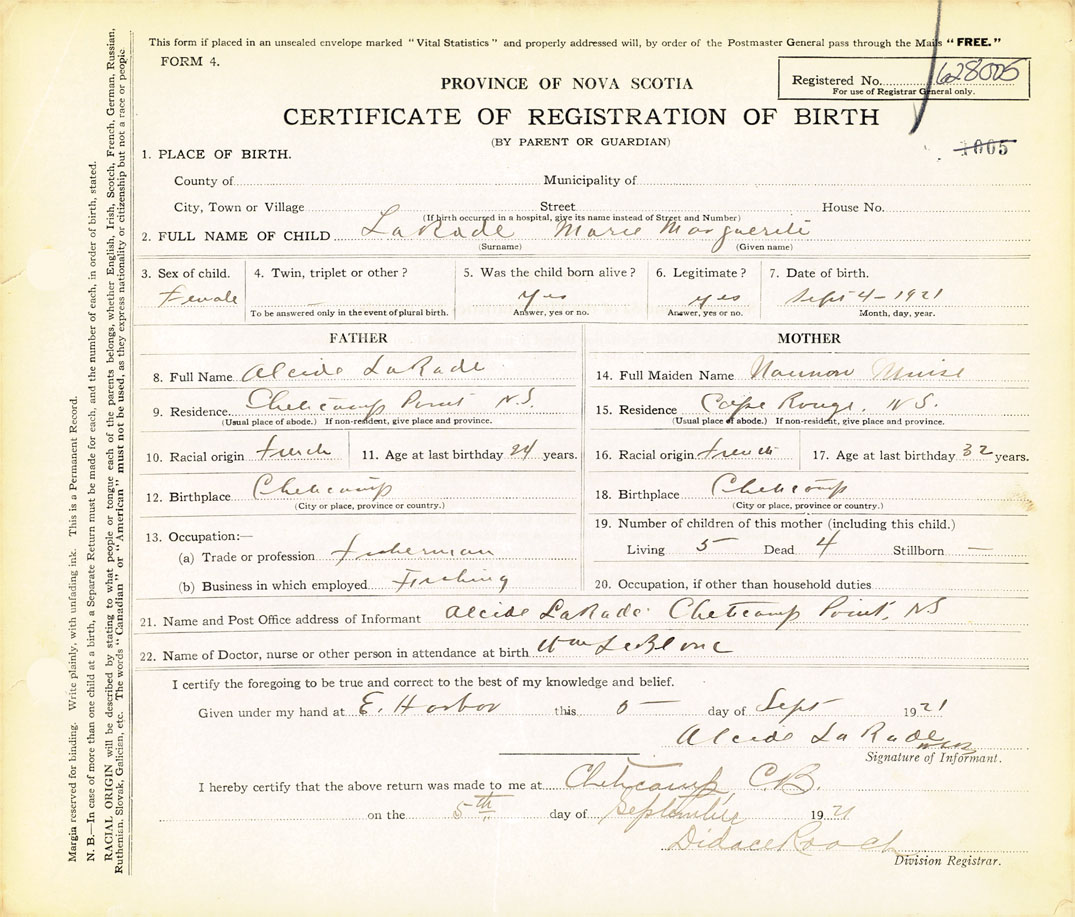 21. Name and Post Office address of Informant Alcide LaRade Cheticamp Point