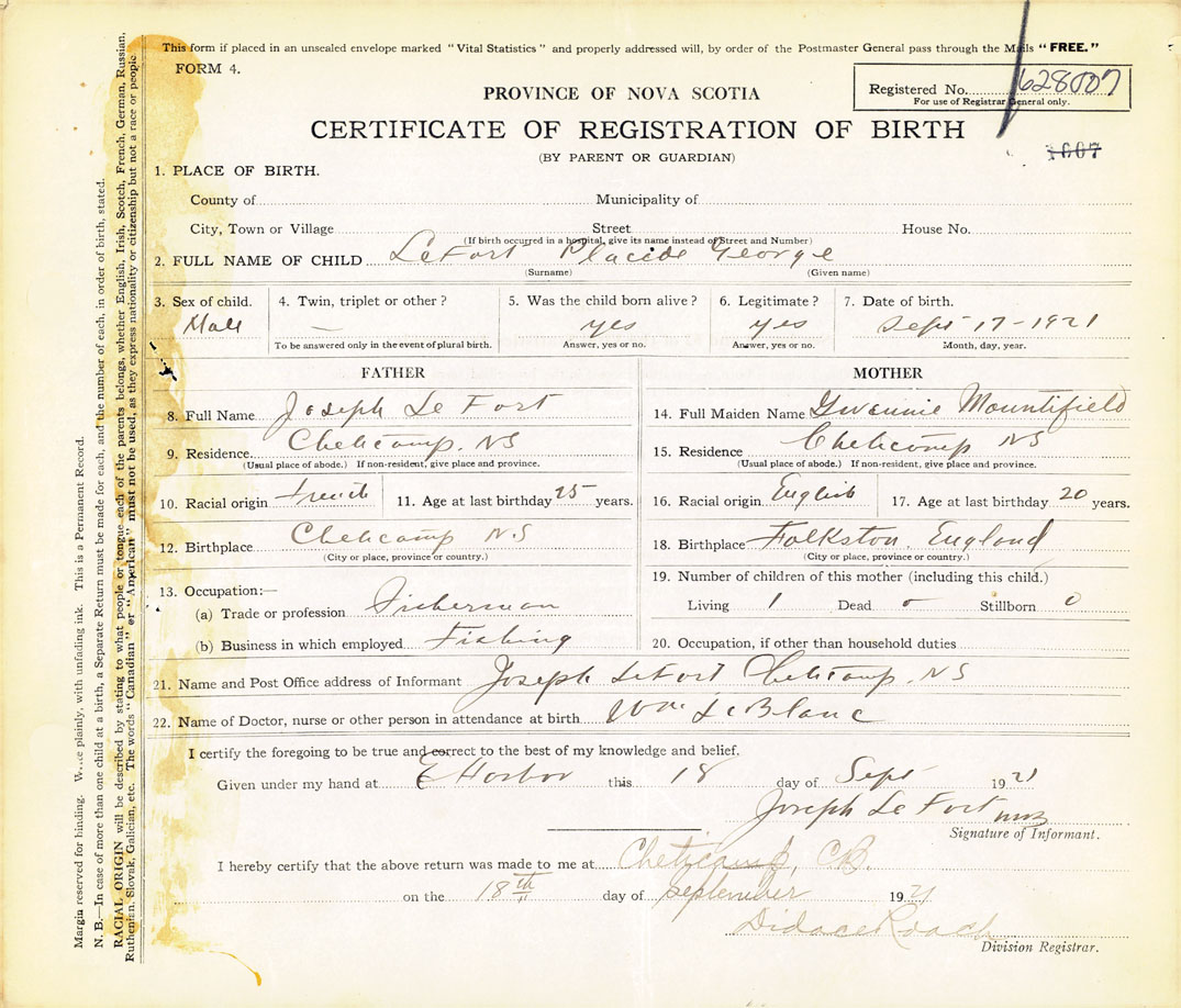 22. Name of Doctor, nurse or other person in attendance at birth William LeBlanc