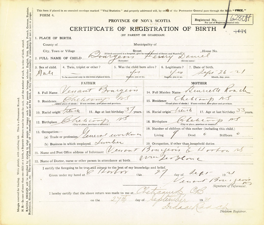 21. Name and Post Office address of Informant Venant Bourgeois Eastern Harbour