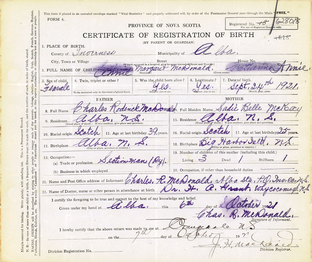 22. Name of Doctor, nurse or other person in attendance at birth Dr. HA Grant, Whycocomagh