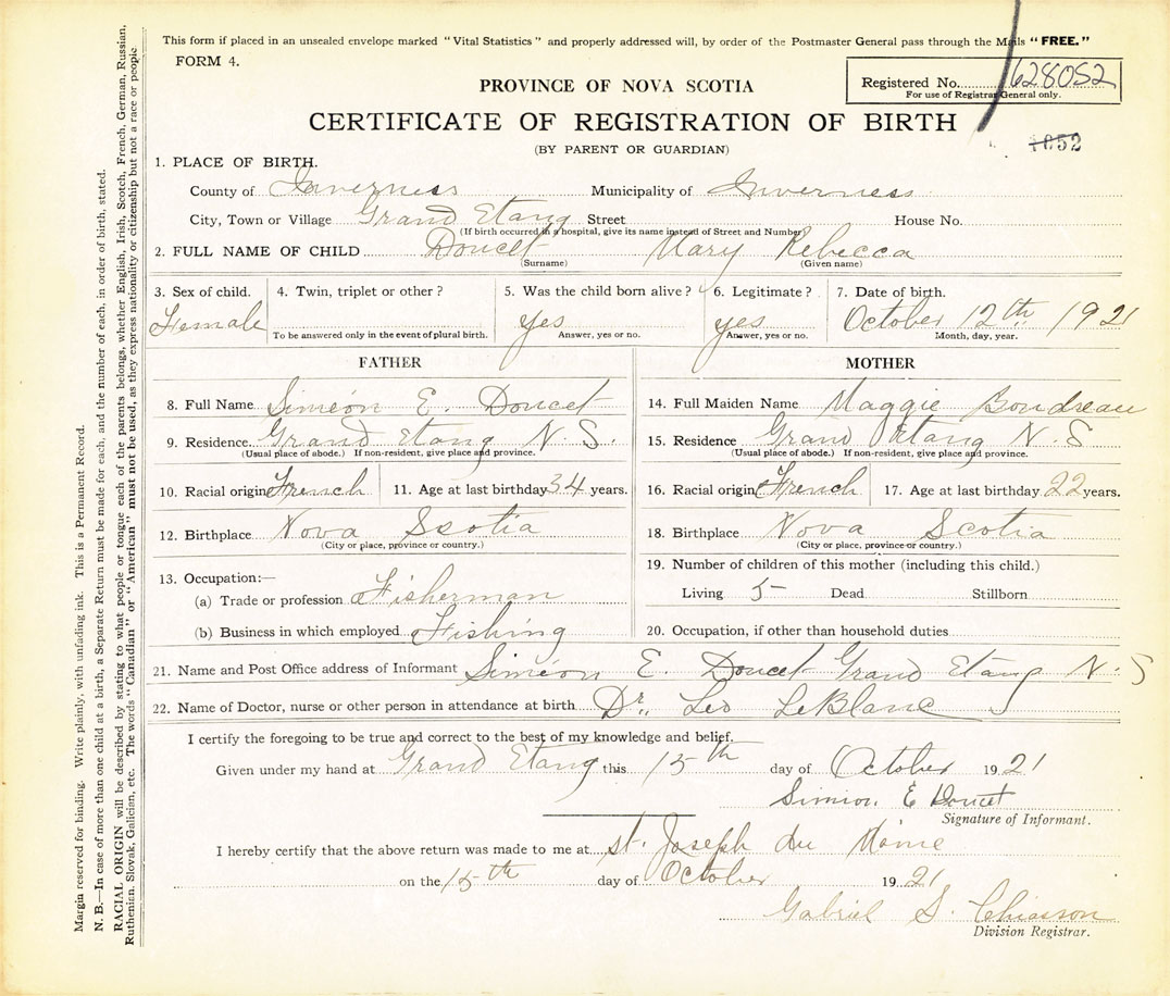 21. Name and Post Office address of Informant Simion E Doucet Grand Etang N.S.