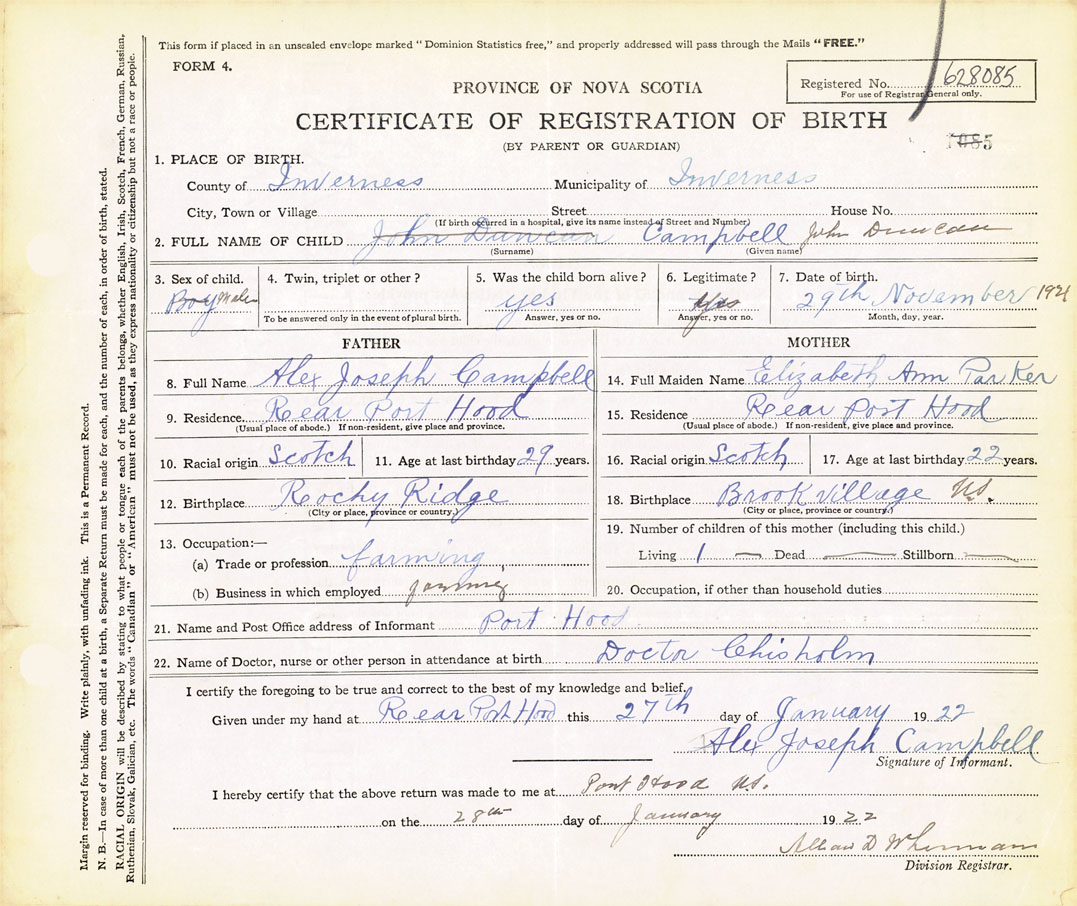 21. Name and Post Office address of Informant Alex Joseph Campbell Port Hood