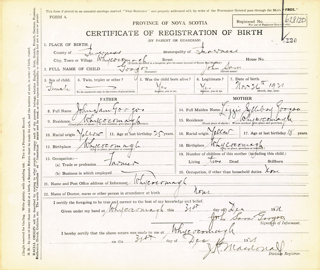 21. Name and Post Office address of Informant John Sam Googoo Whycocomagh