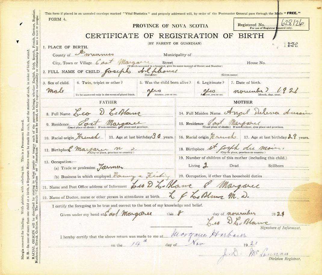 2. FULL NAME OF CHILD LeBlanc, Joseph Alphonse