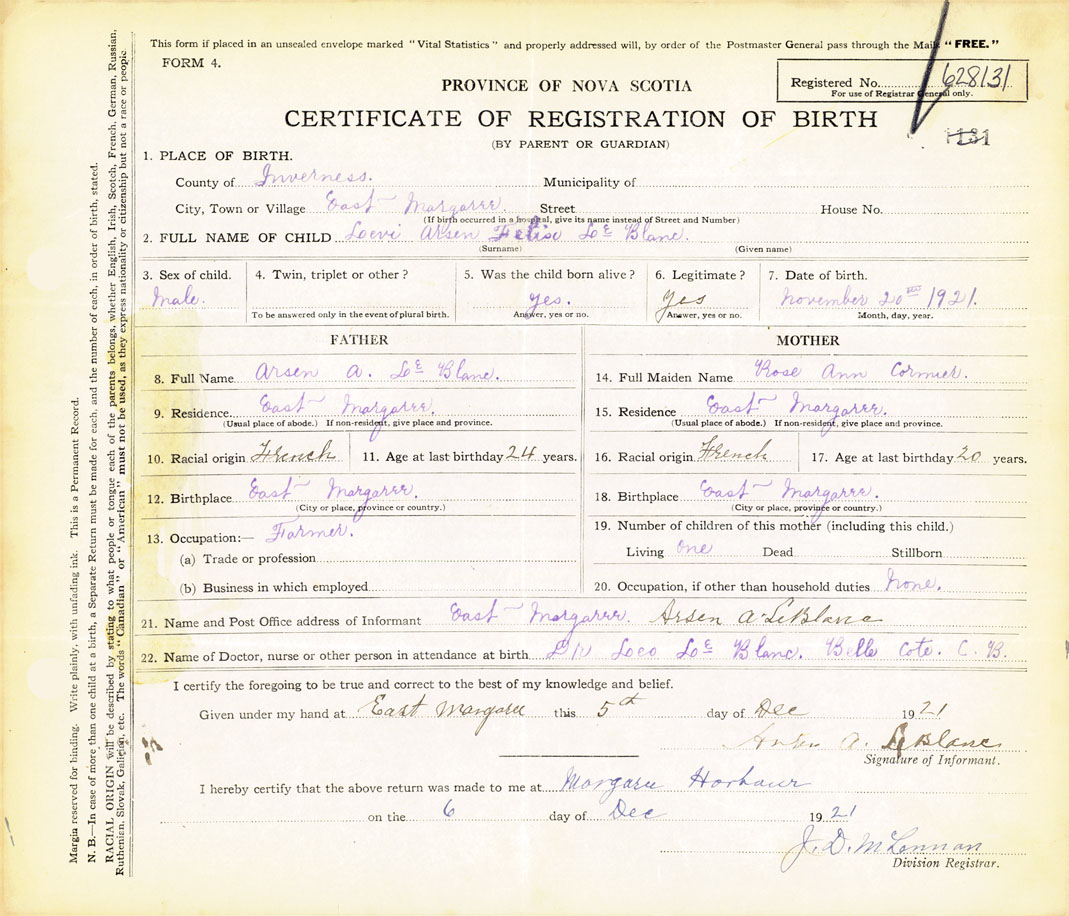 22. Name of Doctor, nurse or other person in attendance at birth Dr. Leo LeBlanc, Belle Cote, CB