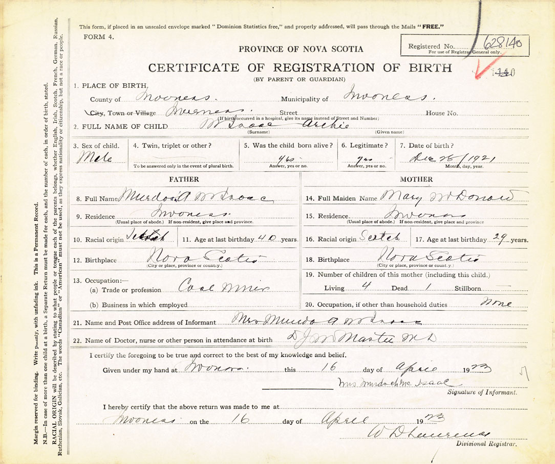 21. Name and Post Office address of Informant Mrs. Murdoch A. McIsaac