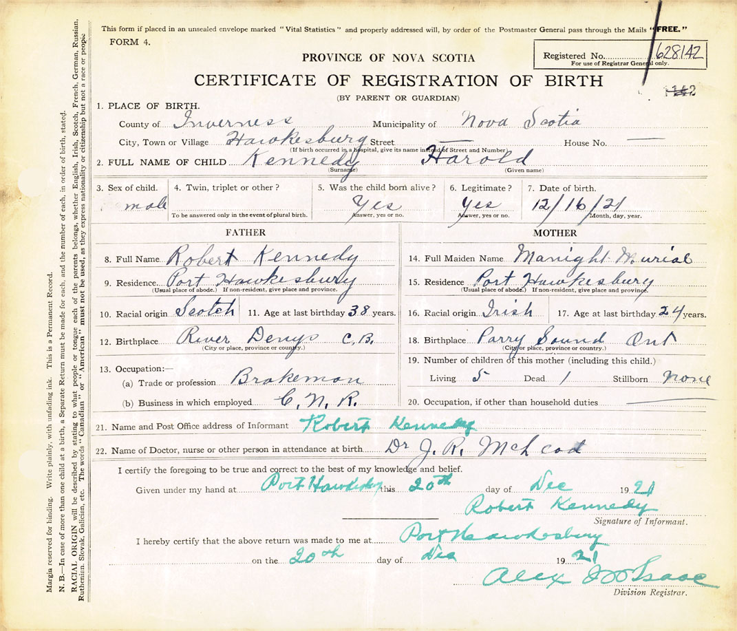 21. Name and Post Office address of Informant Robert Kennedy Port Hawkesbury