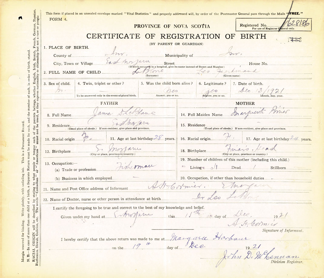 22. Name of Doctor, nurse or other person in attendance at birth Dr. Leo LeBlanc