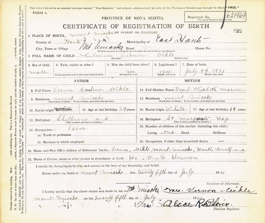 21. Name and Post Office address of Informant Mrs. Vernon Oikle Mount Uniacke