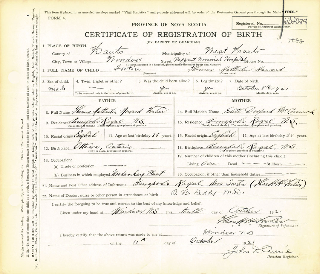 21. Name and Post Office address of Informant Thomas H.H. Fortier Annapolis Royal
