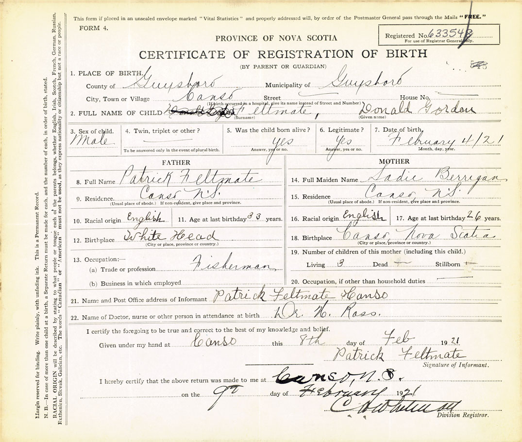 2. FULL NAME OF CHILD Feltmate, Donald Gordon