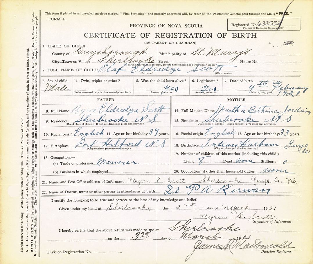 21. Name and Post Office address of Informant Byron E. Scott Sherbrooke, Guysborough