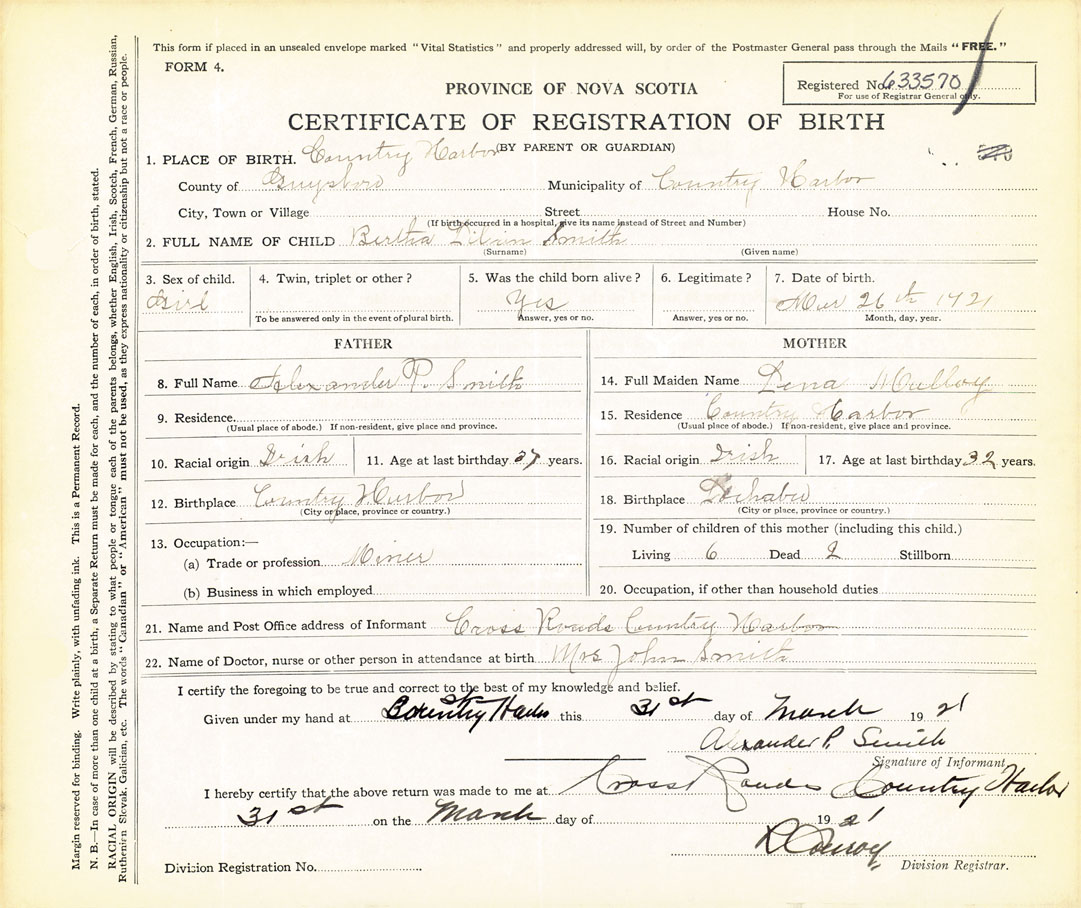 21. Name and Post Office address of Informant Alexander P. Smith Cross Roads, Country Harbour