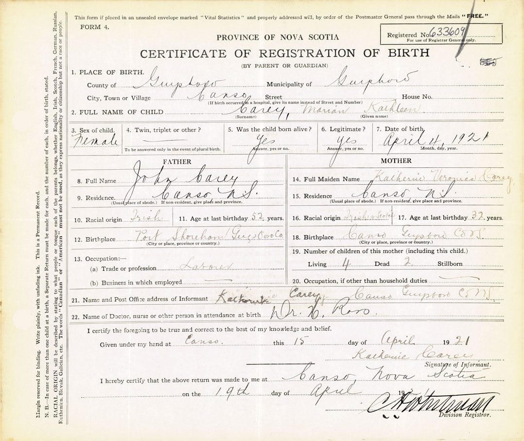 21. Name and Post Office address of Informant Katherine Carey Canso, Guysboro