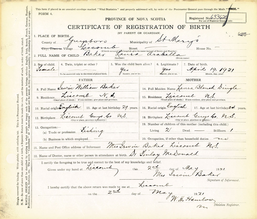 21. Name and Post Office address of Informant Mrs. Irwin Baker Liscomb ,NS