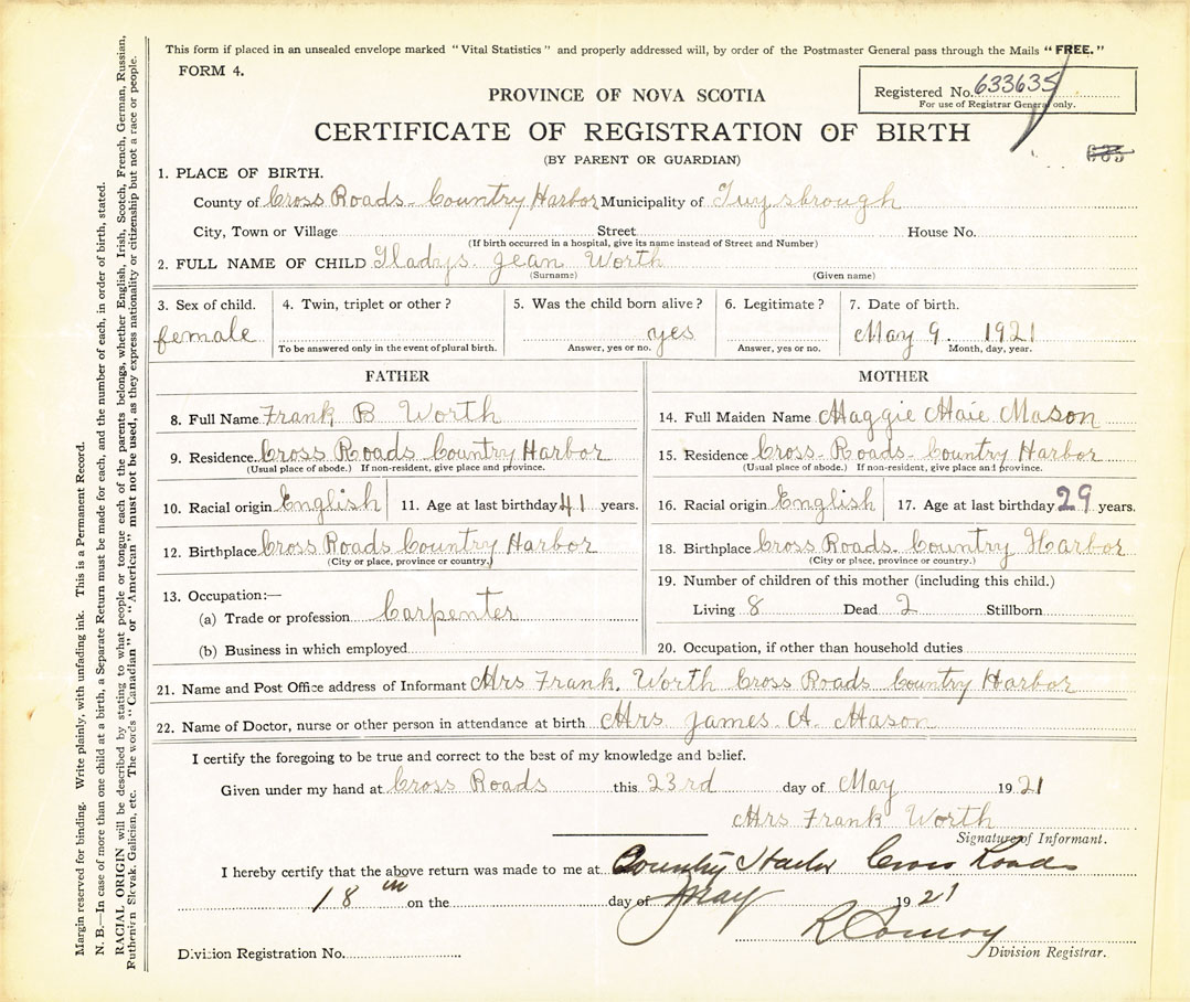 21. Name and Post Office address of Informant Mrs. Frank Worth Cross Roads Country Harbor