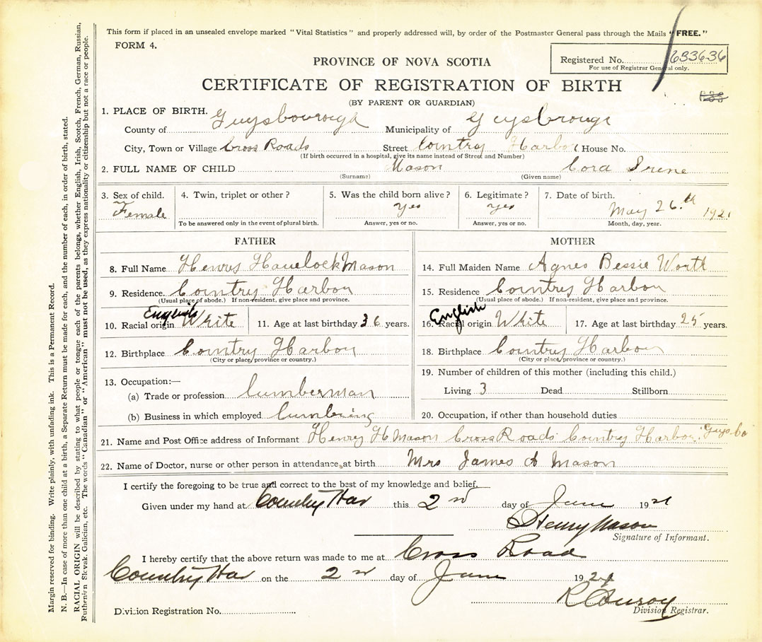 21. Name and Post Office address of Informant Henry Mason Cross Roads Country Harbor, Guysborough