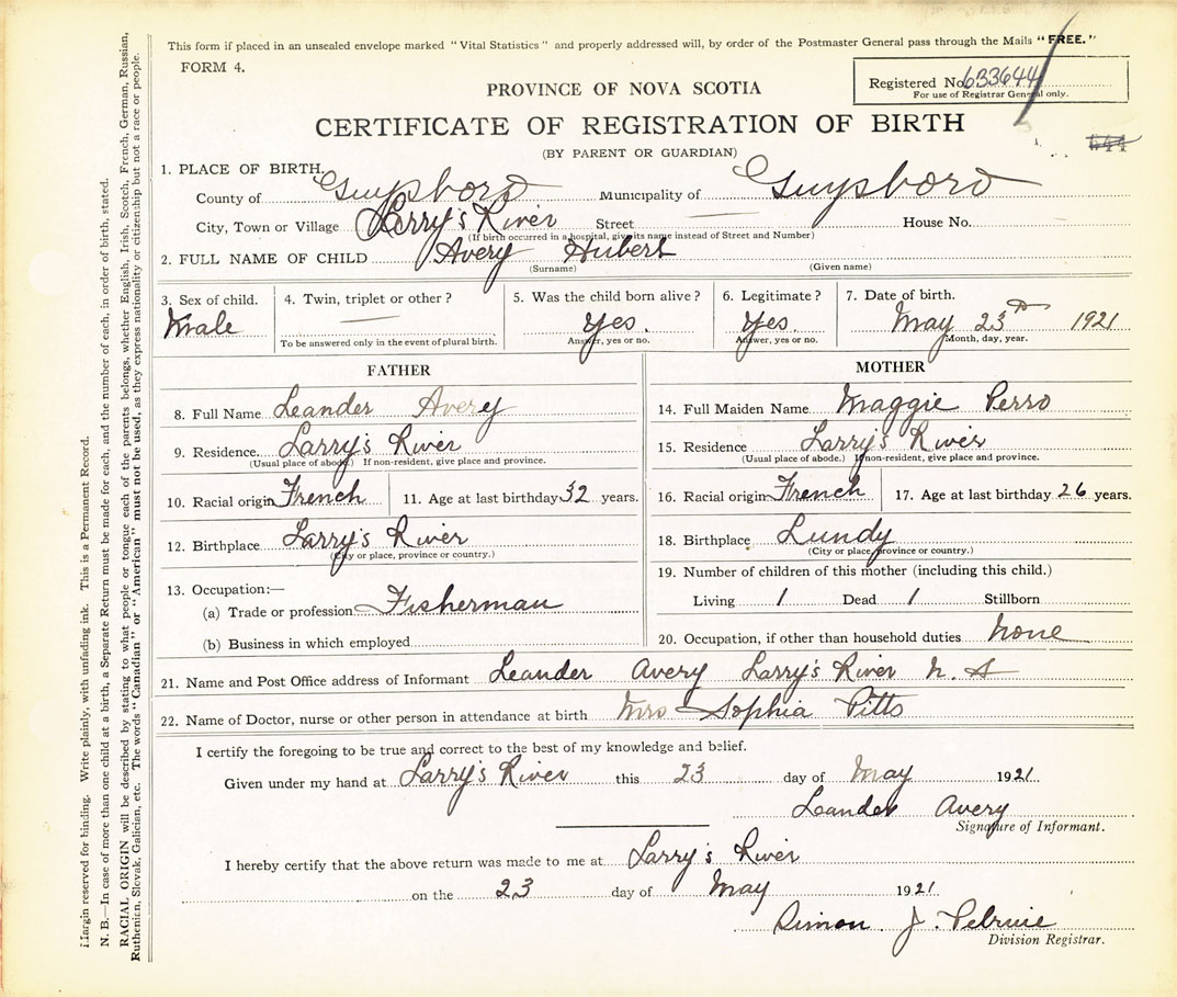 21. Name and Post Office address of Informant Leander Avery Larrys River N.S.
