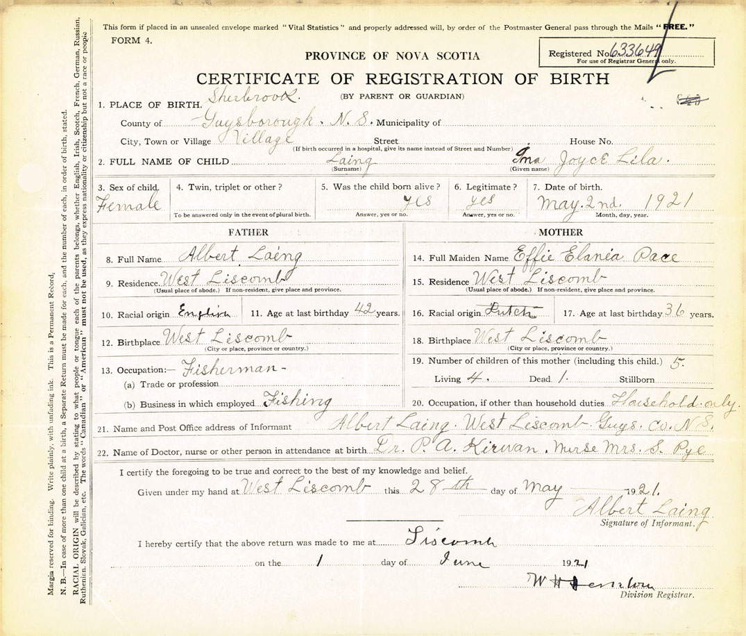 21. Name and Post Office address of Informant Albert Laing West Liscomb, Guysborough
