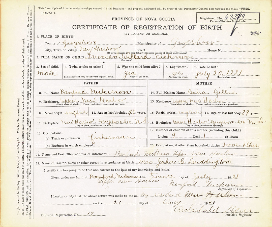 18. Birthplace New Harbour, Guysborough Co., N. S