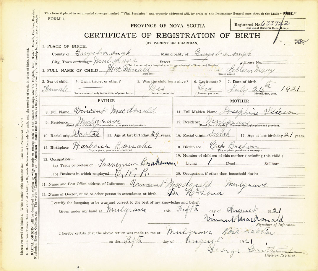 2. FULL NAME OF CHILD MacDonald, Eileen Mary