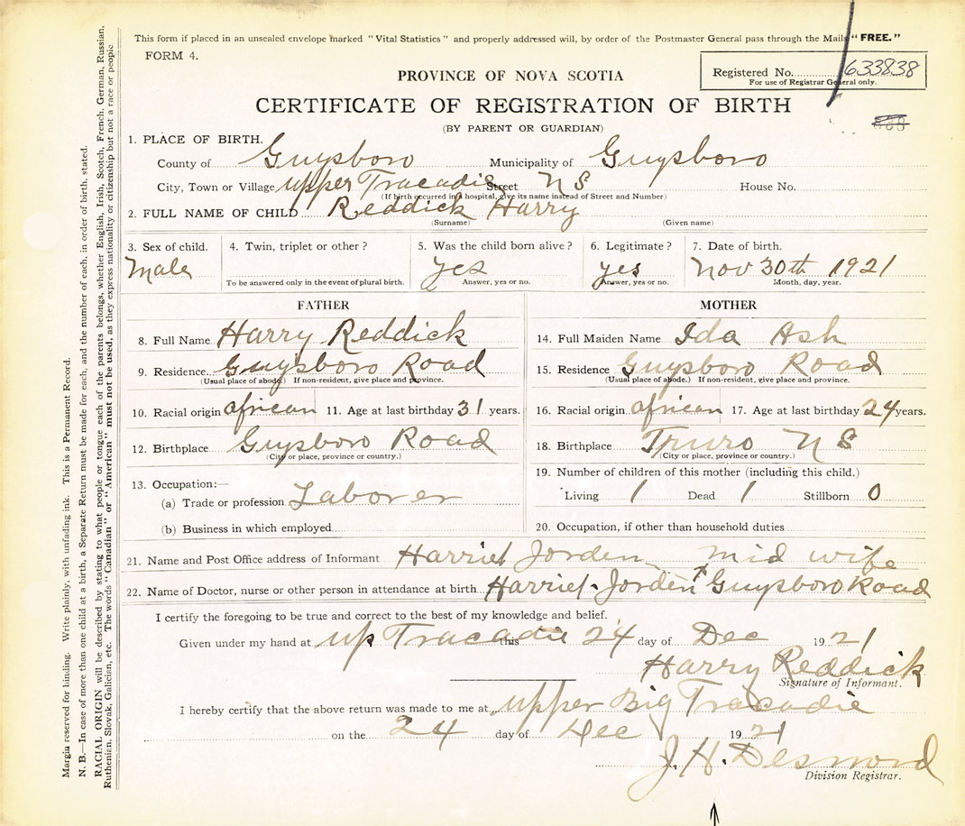 21. Name and Post Office address of Informant Harriet Jorden Guysboro Road