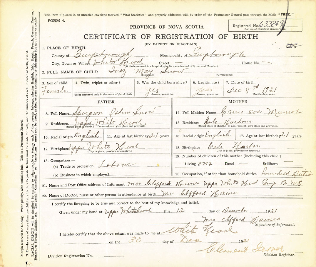 21. Name and Post Office address of Informant Mrs Clifford Haines Upper White Head, Guys