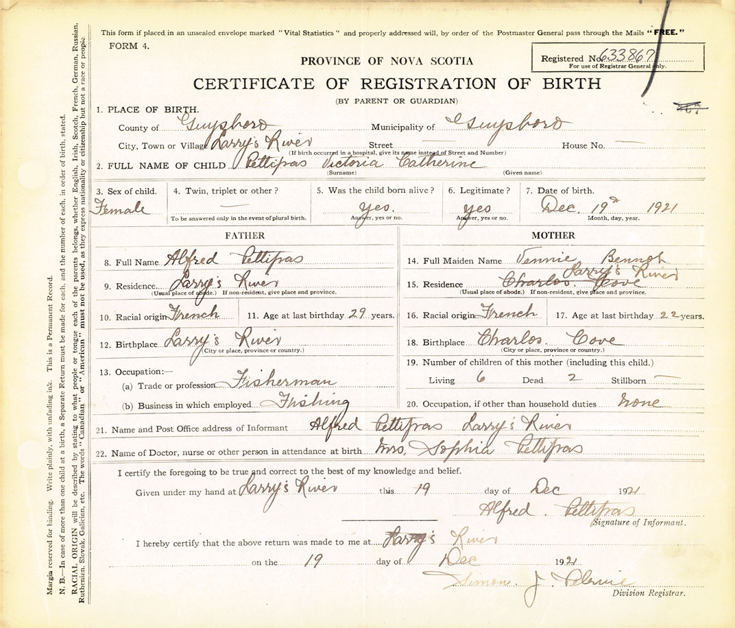 22. Name of Doctor, nurse or other person in attendance at birth Mrs. Sophia Pettipas