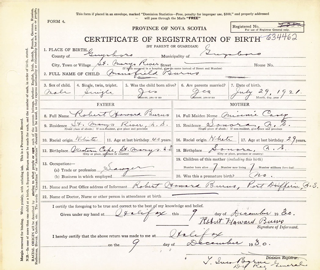 21. Name and Post Office address of Informant Robert Howard Burns Port Dufferin, NS
