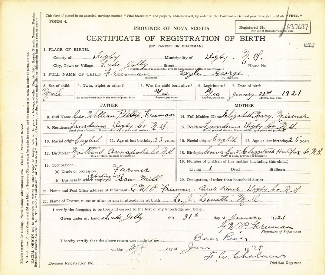 21. Name and Post Office address of Informant G W P Freeman Bear River, Digby