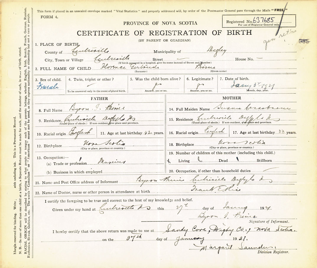 Female Birth Registration: Year: 1921 number: 63700685