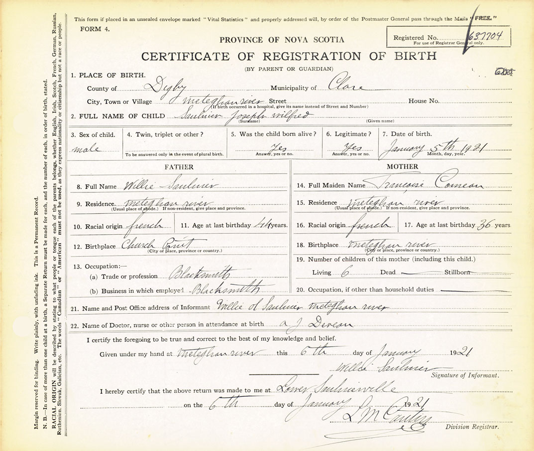 21. Name and Post Office address of Informant Willie Saulnier Meteghan River