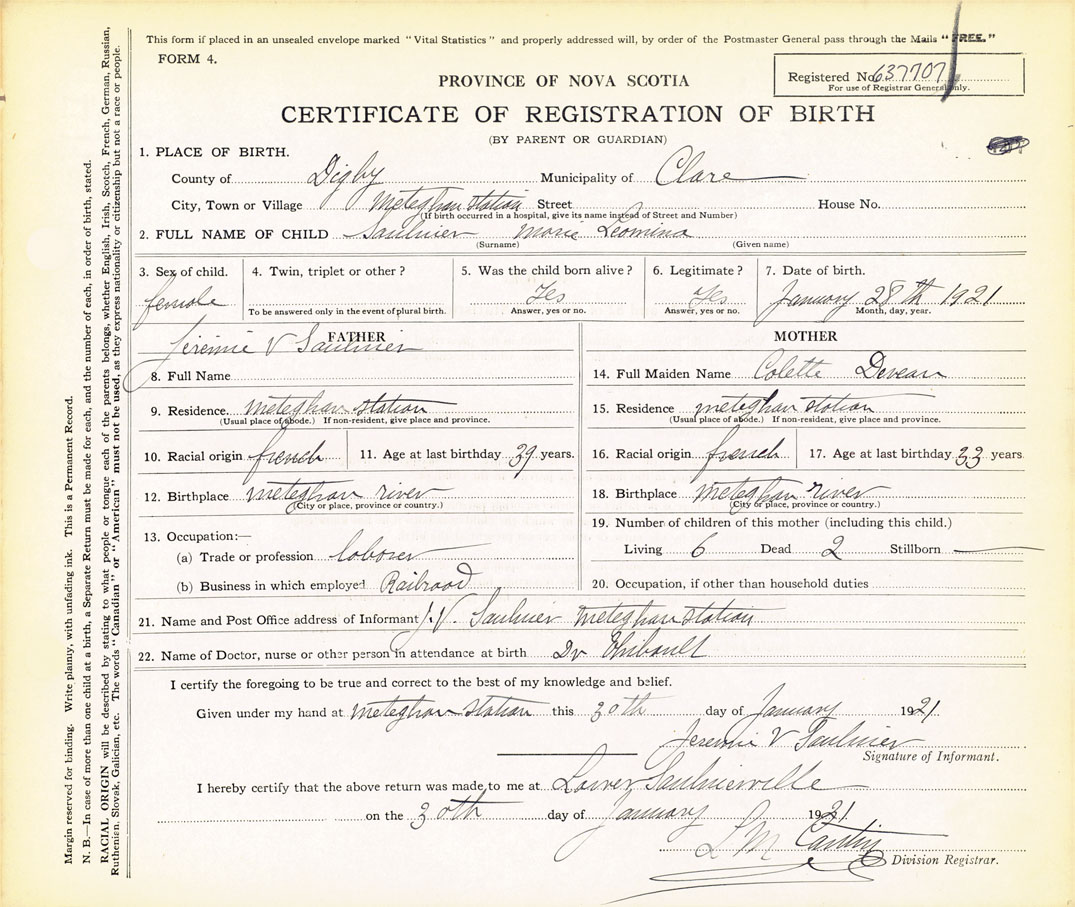 21. Name and Post Office address of Informant Jeremie V Saulnier Meteghan Station