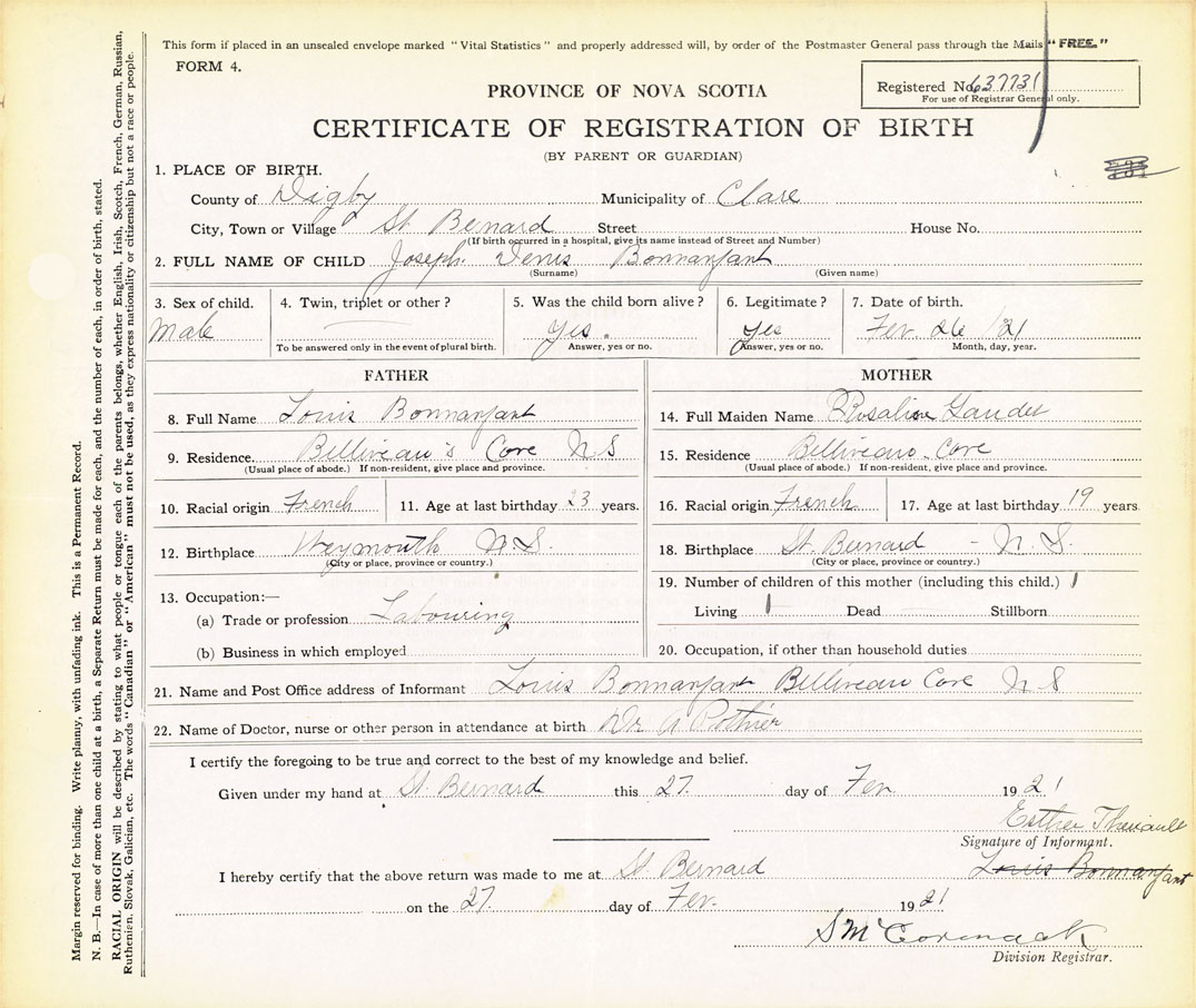 21. Name and Post Office address of Informant Louis Bonnanfant Belliveau Cove