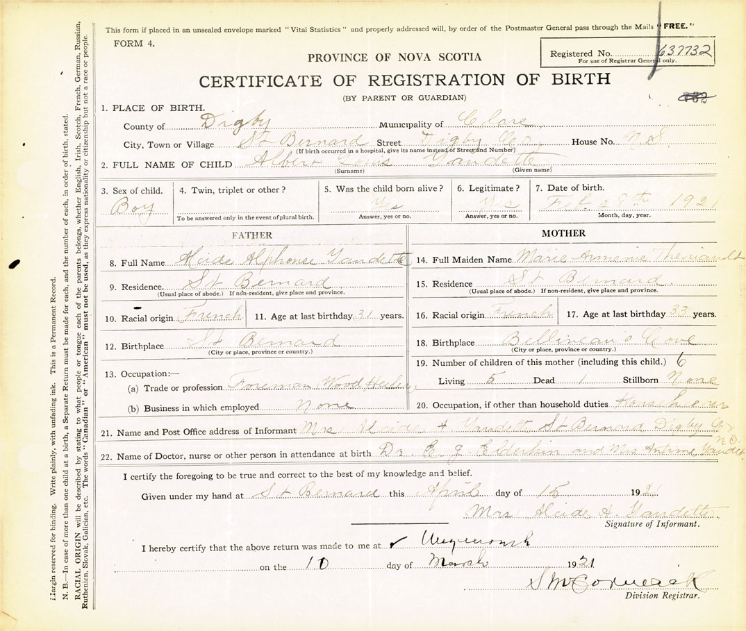 21. Name and Post Office address of Informant Mrs Alcide A Gaudette St Bernard, Digby Co