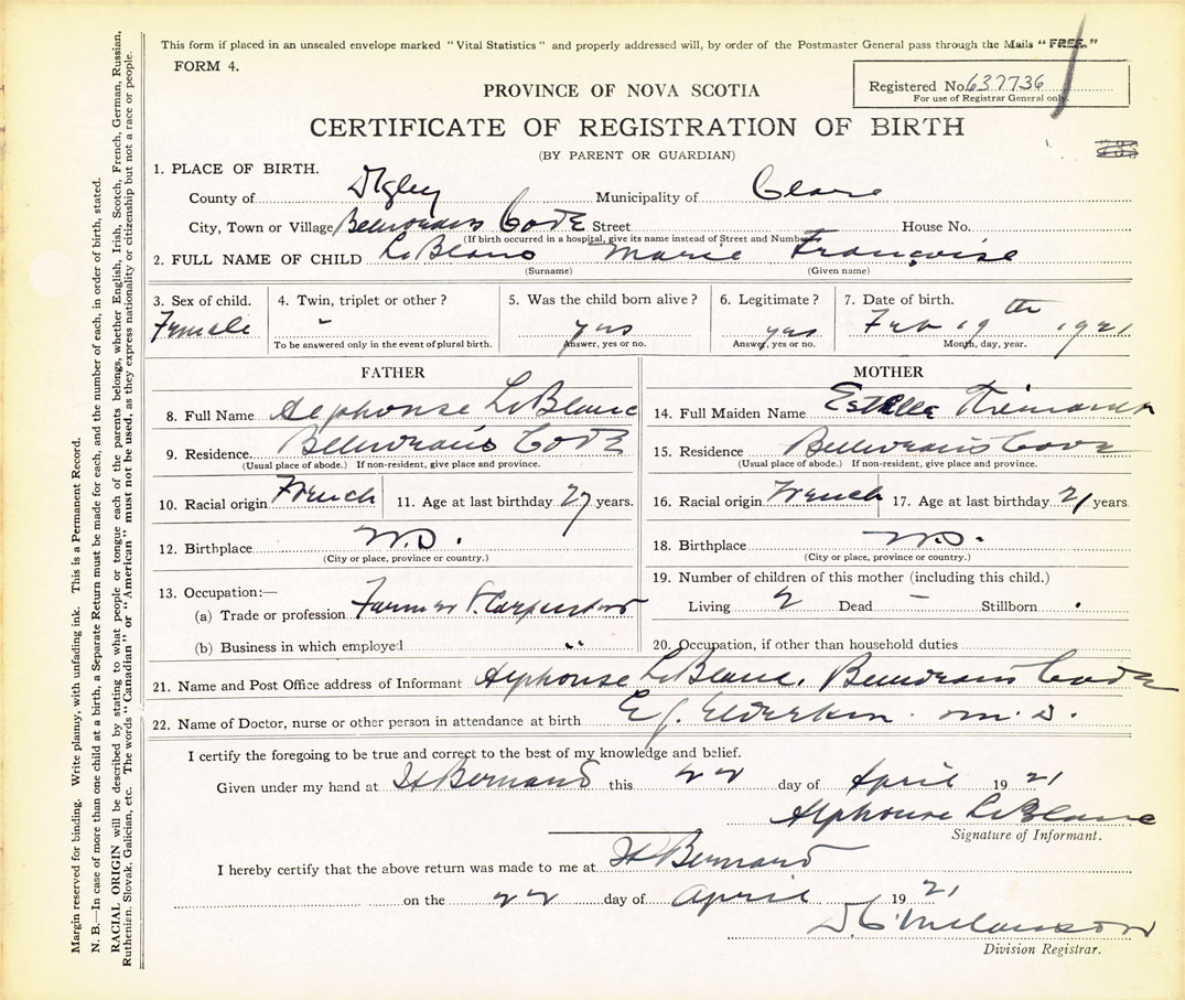 21. Name and Post Office address of Informant Alphonse LeBlanc Belliveau Cove