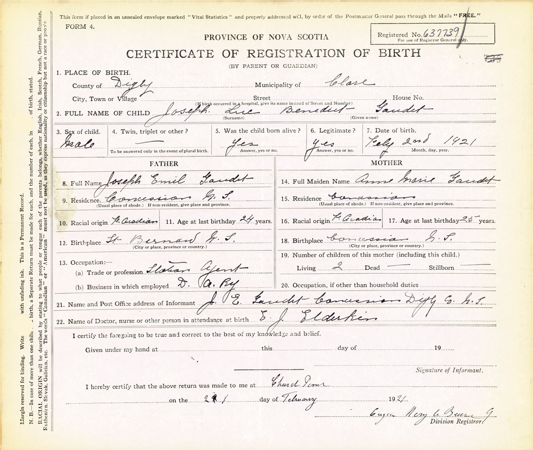 21. Name and Post Office address of Informant J E Gaudet Concession Digby Co