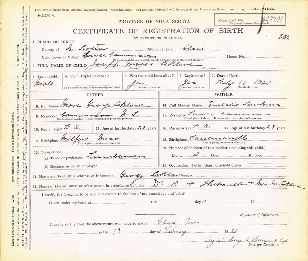 22. Name of Doctor, nurse or other person in attendance at birth Dr. R. H. Thibault and Mrs. M. LeBlanc