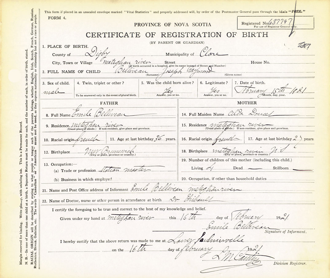 21. Name and Post Office address of Informant Emile Belliveau Meteghan River