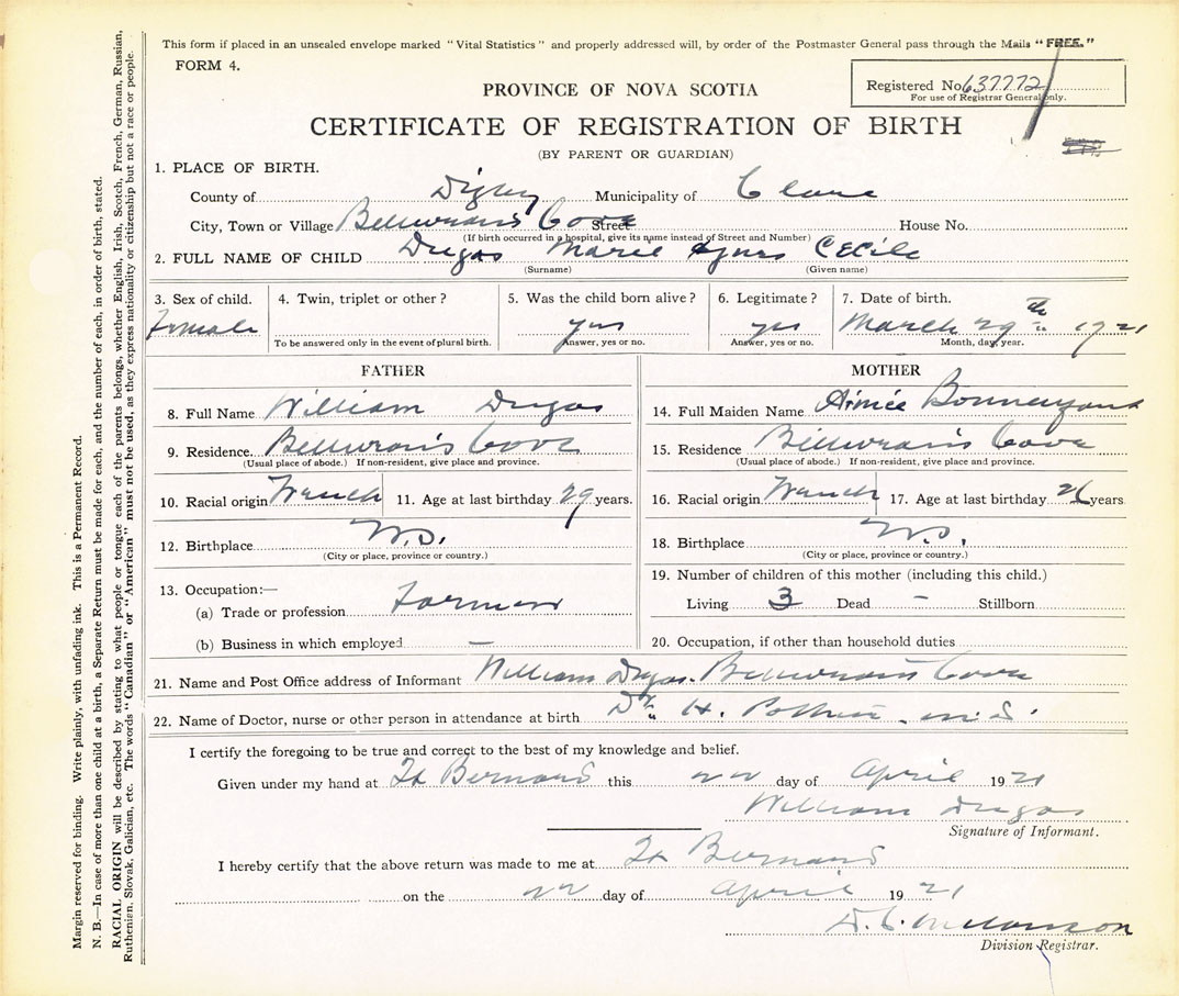 21. Name and Post Office address of Informant William Dugas Belliveaus Cove