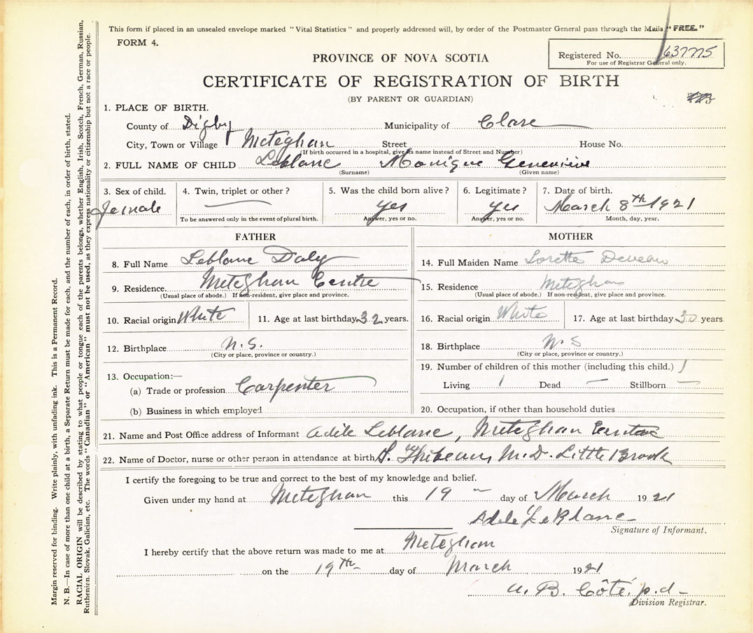 21. Name and Post Office address of Informant Adèle LeBlanc Meteghan Centre