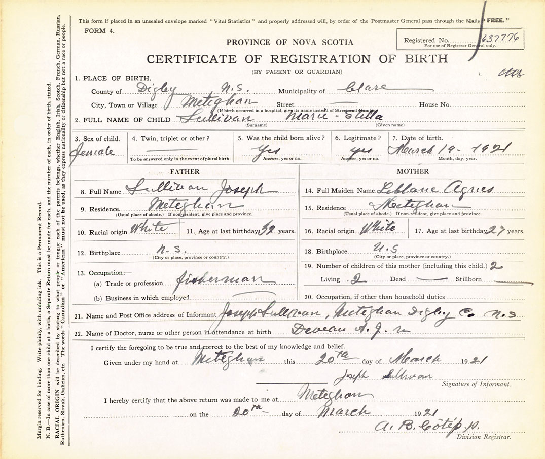 21. Name and Post Office address of Informant Joseph Sullivan Meteghan, Digby Co