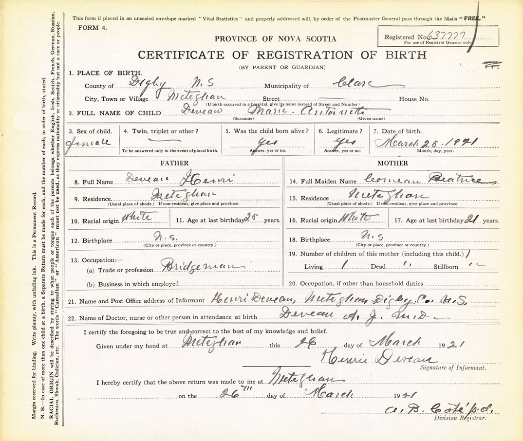 21. Name and Post Office address of Informant Henri Deveau Meteghan, Digby County
