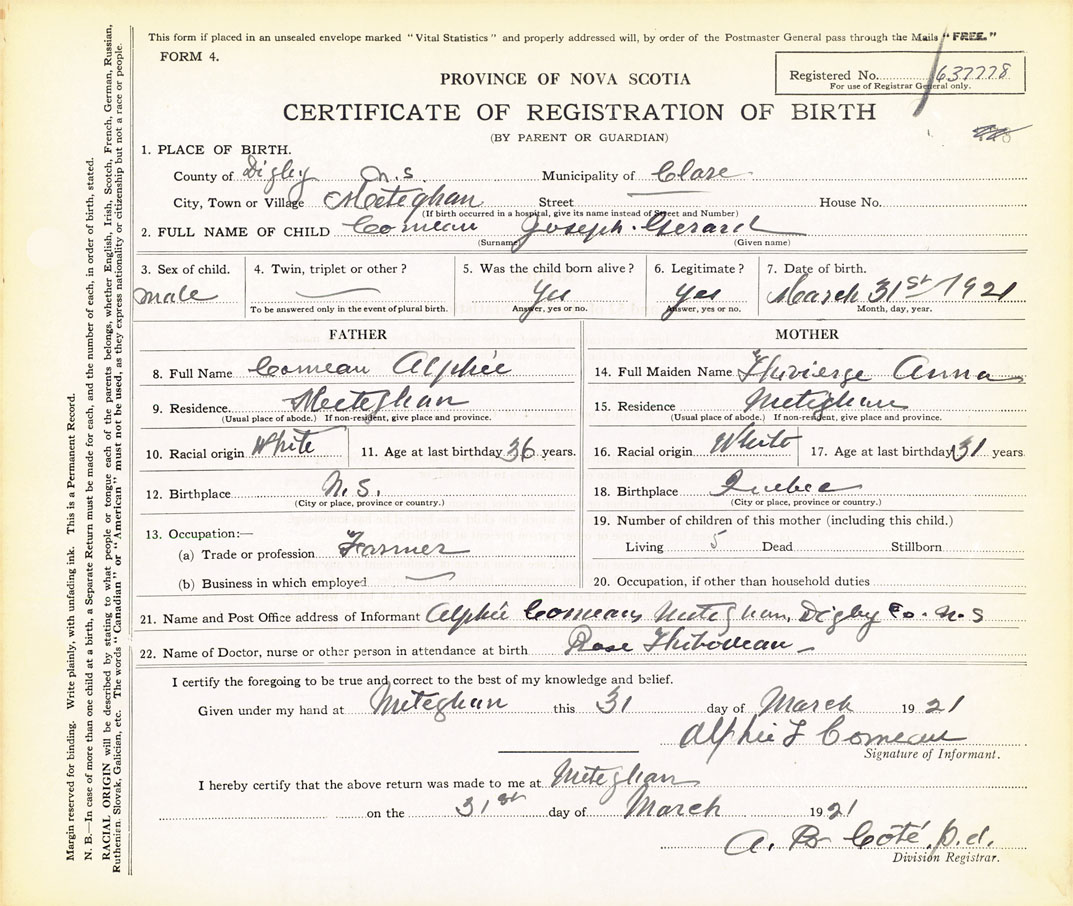 21. Name and Post Office address of Informant Alphee Comeau Meteghan Digby Co