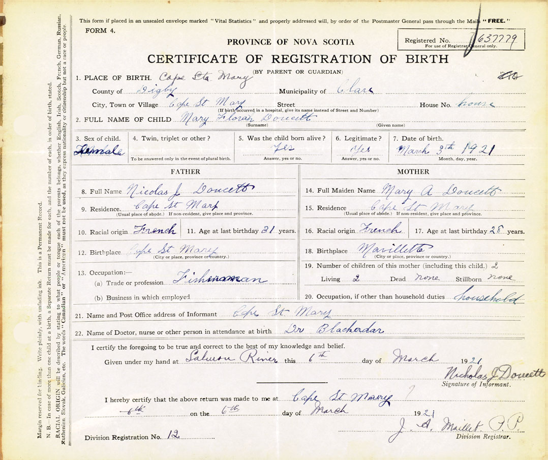 21. Name and Post Office address of Informant Nicholas J Doucett Cape St Mary