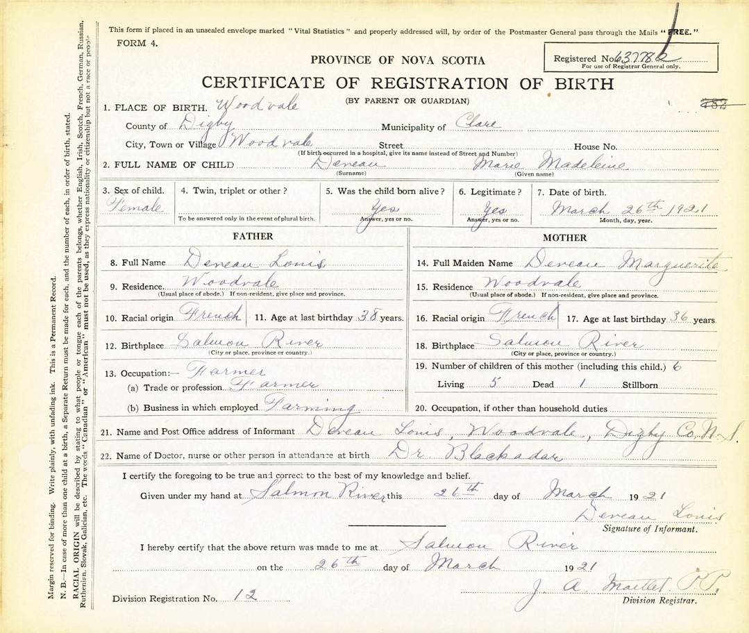 21. Name and Post Office address of Informant Louis Deveau Woodvale, Digby County