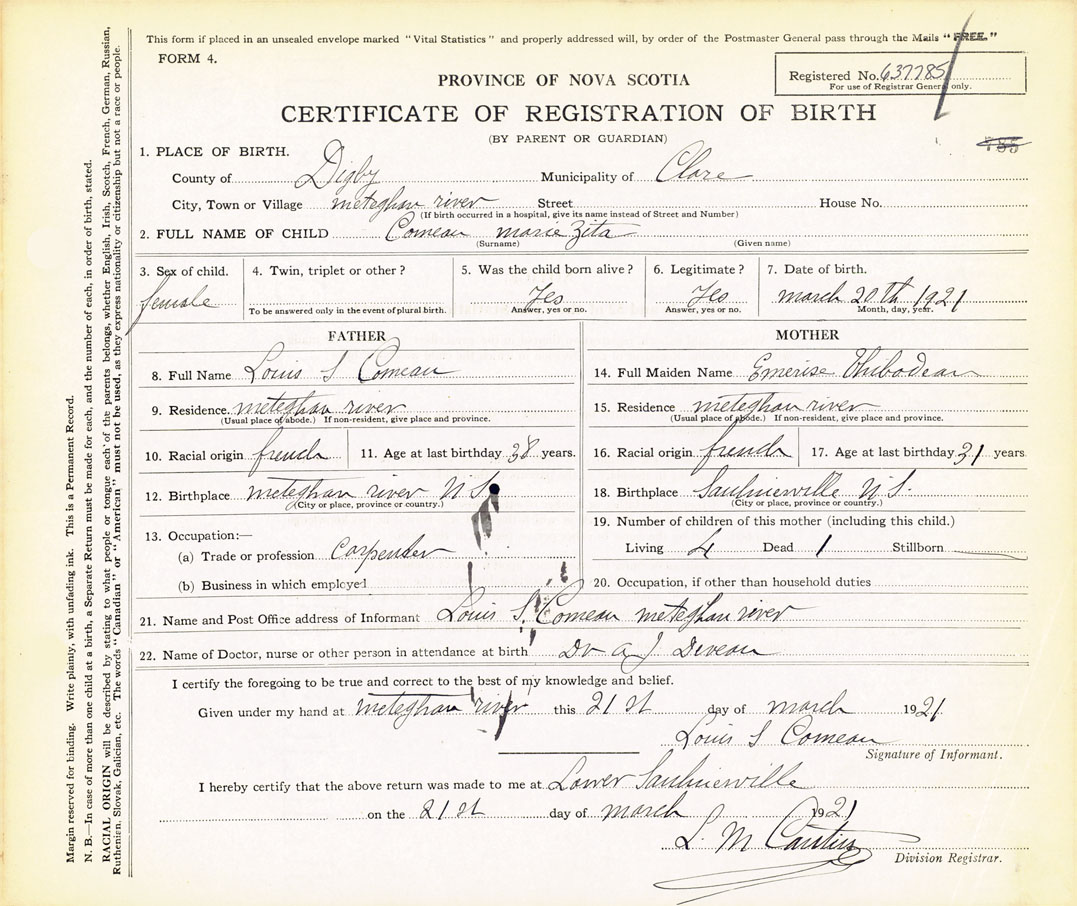 21. Name and Post Office address of Informant Louis J Comeau Meteghan River