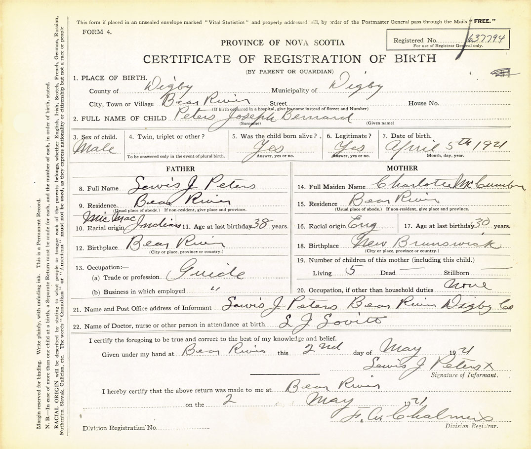 21. Name and Post Office address of Informant Lewis J Peters Bear River, Digby